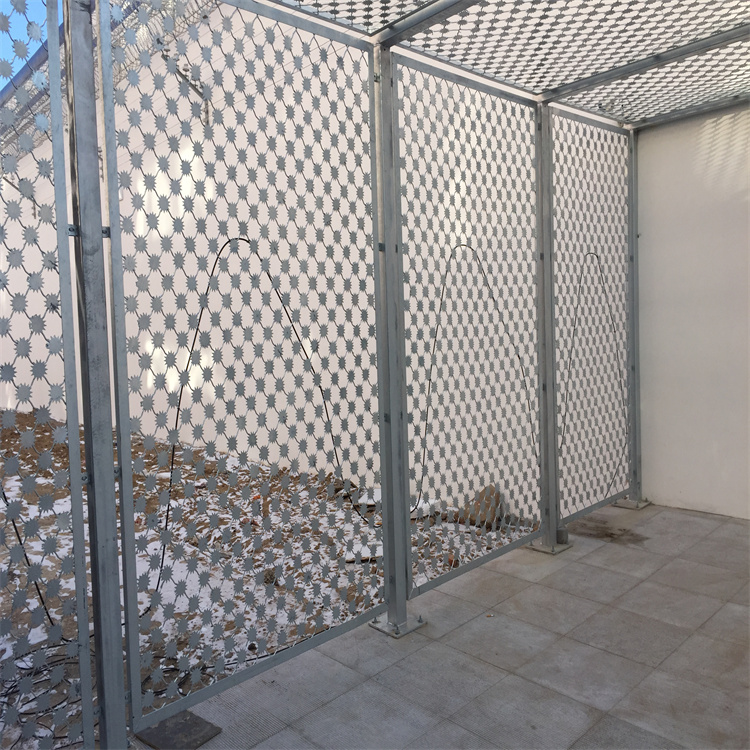 材料通常選擇和立柱同等材料或者稍小規格材料搭配使用。V型支架的加裝是為了將蛇腹形刀刺網固定在鋼網墻頂部,從而有效的增加防攀爬性和安全性。V型支架加防拆卸刀刺網。刀刺網的直徑一般為500mm、600mm、800mm,材質均為優質304不銹鋼,鎳合量8個以上。刺網芯線直徑為2.5mm、萬片長22mm,刀片寬度15mm,刀片度0.5mm。蛇形刀刺網的排列密度不小于16圈米,相鄰每圈間不大于120mm.