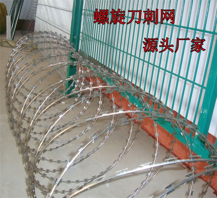 刀片刺網也稱刀片刺絲、刺絲滾籠、刺繩防護網,是一種新型護欄網產品。特點:阻嚇震懾效果好、美觀、施工便利,經濟實用,安全防護防爬等優異特點。