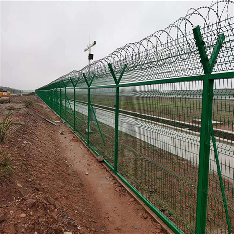 機(jī)場圍界網(wǎng)選用低碳鋼絲編制焊接而成,具有美觀,實(shí)用,方便運(yùn)輸和安裝的特點(diǎn)。在機(jī)場護(hù)欄網(wǎng)的橫向加裝四道折彎加強(qiáng)筋,即增加美觀性,同時增加網(wǎng)片強(qiáng)度,在整體成本增加不多的同時,使網(wǎng)面強(qiáng)度和美感顯著增加,是目前國內(nèi)外比較受歡迎的產(chǎn)品。頂部增加50CM“V”型角配合刀片刺繩使用,更增加防攀爬和安全性能;自動交叉焊接而成,焊點(diǎn)整潔,防腐性極強(qiáng),焊點(diǎn)牢固。
