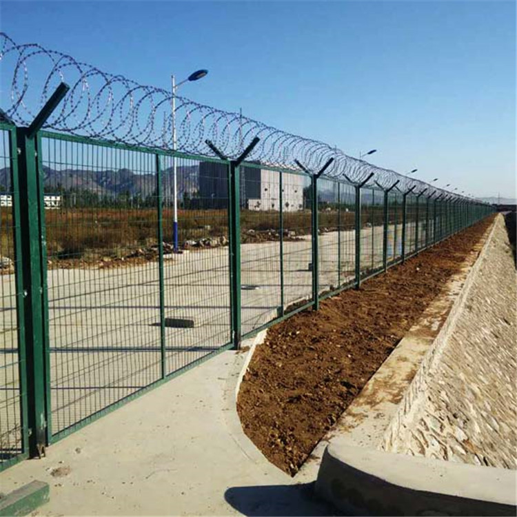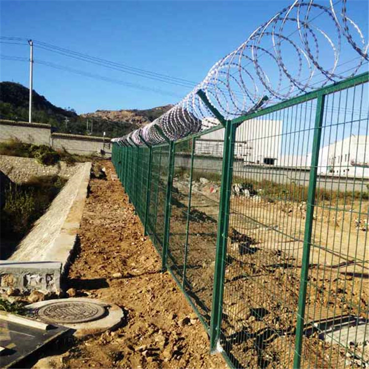 三:鋼絲焊接的網(wǎng)片采用低碳鋼絲焊接而成,表面采用pvc浸塑處理,與刀刺網(wǎng)連接。