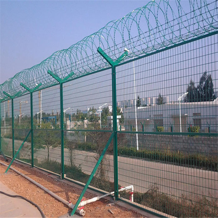 機場護欄網又被稱作“機場圍欄”、“機場護欄”、“Y型安全防御護網”, 機場護欄網主要用于機場護欄使用,產品選用優級低碳鋼絲、鋁鎂合金絲,噴塑。經過編焊而成;網格結構簡練、便于運輸、安裝不受地形起伏限制,特別是對于山地、坡地、多彎地帶適應性極強。機場護欄網的主要特點是網身高大,防攀爬能力強,抗沖擊,表面雙層優質防腐處理,可達到10年的超長壽命,一經推出,就得到了各大機場的高度認可,安平創安護欄網廠生產的機場護欄網具有美觀、經濟實用、防阻效果好、施工便利等優異特點,主要用于工礦企業,園林公寓,邊防哨所,監獄等圈禁防護。 機場護欄網是由V型支架立拄,加強型焊接片網,安全防盜連接件和熱鍍鋅刀片刺籠組成是強度和安全防御性級別很高的防護安全效果。