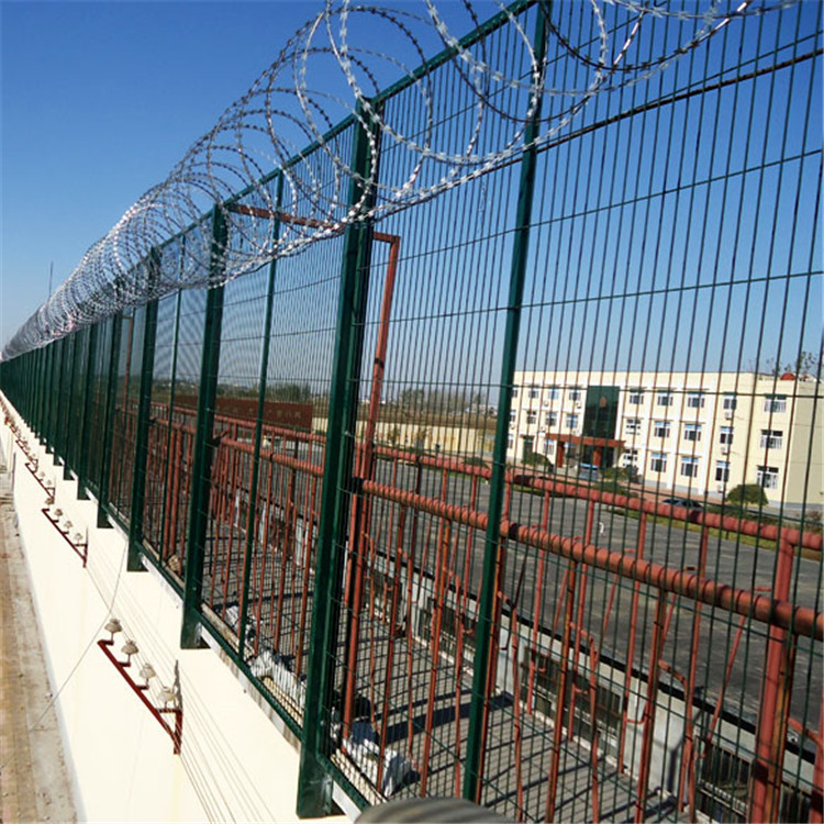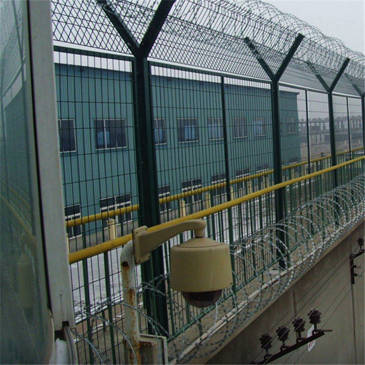 監獄鋼網墻-監獄防沖撞鋼網墻-監獄防護網采用高強度的刀片刺網與普通防護網的結合,由V型支架立拄,加強型焊接片網,安全防盜連接件和組成。