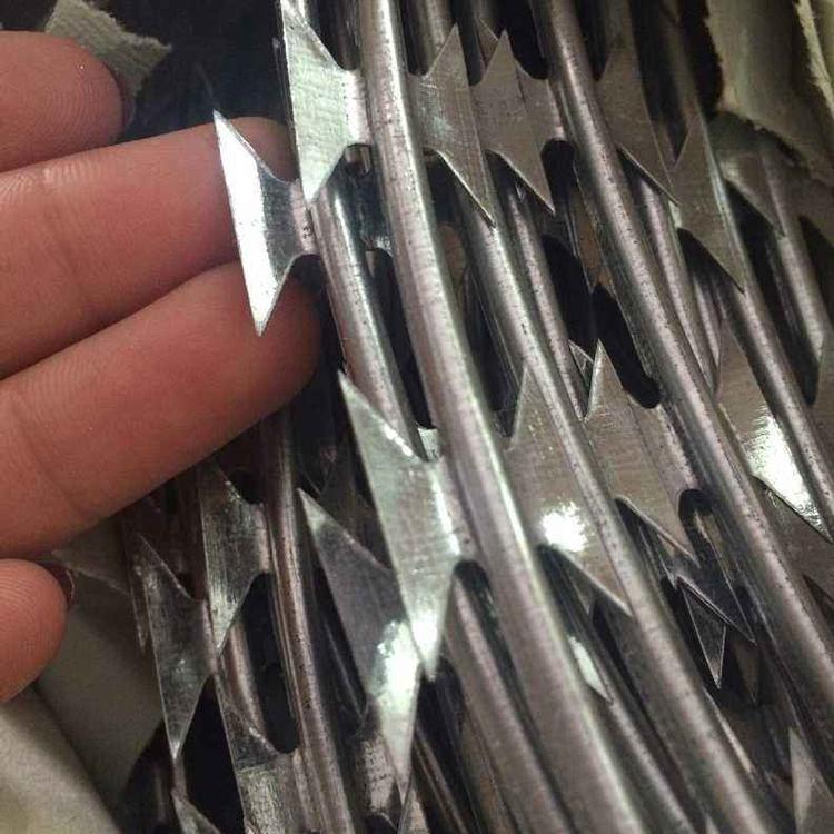刀片刺網是一種近年起來的防護,隔離能力比較強的防護產品,采用優質鋼片沖壓尖刺包裹高強度鋼絲壓制而成,雙線用卡扣銜接固定,呈現螺旋型,即美觀又讓人不寒而栗,起來了很好的阻嚇作用。