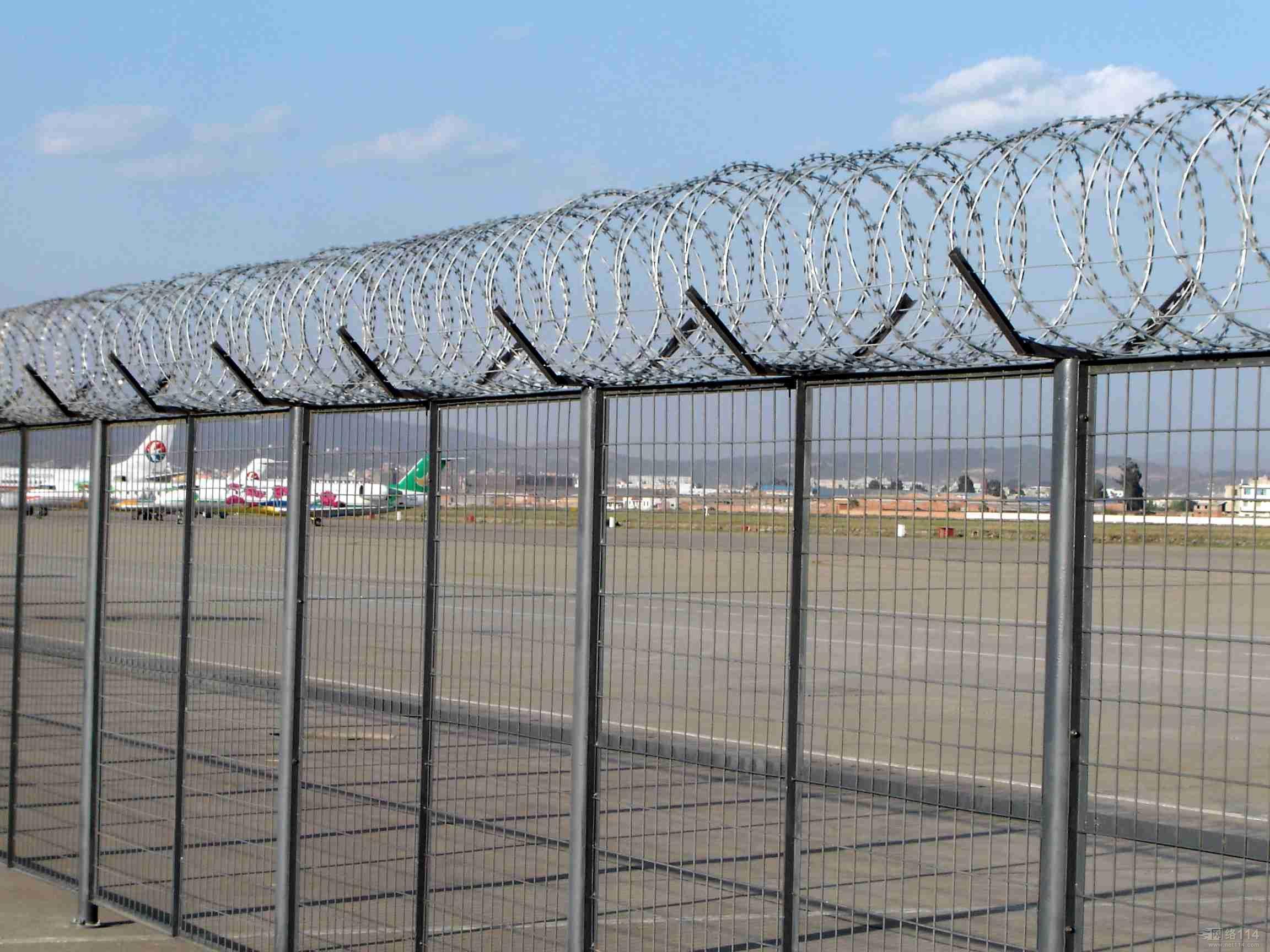 焊接圍界網(wǎng)片的鋼絲直徑必須大于等于5mm。機場圍界的立柱應采用60*60mm方管制成,管壁厚度不得低于2mm,立柱及網(wǎng)片的表面防腐年限不能低于8年。艾瑞機場圍界網(wǎng)頂部安裝的刀片刺網(wǎng)直徑在500mm、600mm、700mm,刺圈間距20-25cm。機場鋼筋圍界網(wǎng)的立柱基礎應采用現(xiàn)澆混凝土制成,截面500*500mm,高度800mm。