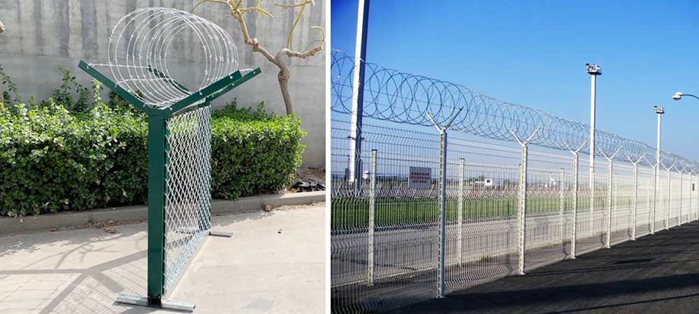 1、機場圍界護欄網的頂部可以加裝一個刀片刺絲,刀片刺絲的安裝可以增強安全管理系統的防護作用。