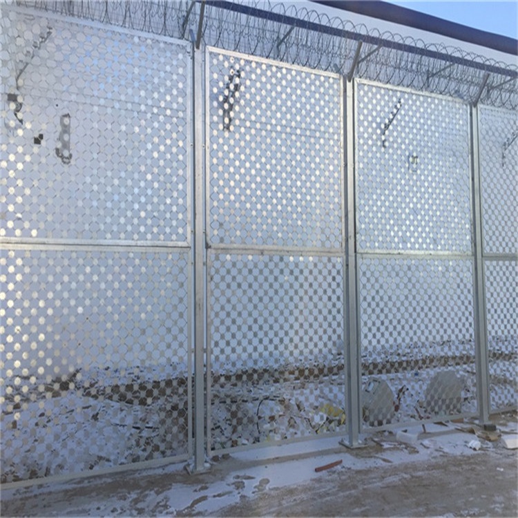 監獄金屬隔離網墻的主體一般由網片、立柱、頂部 V 型網、蛇腹型刀刺網幾大部分及 連接配件組成。