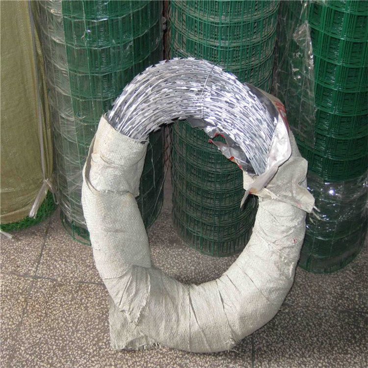 刀片刺絲是沖剪鋼板成銳利的尖刀帶子,然后包裹中碳鋼絲(筋絲)之上。刀片刺絲是從海外引進的禁止通過的新型隔離產品。鋒利的刀片刺絲由雙根線扣卡子組裝后成蛇腹狀,讓人看到不寒而粟,能夠起到了恐嚇作用,實際上人挨上刀片刺絲就被劃破,實際效果明顯。該產品施工便利快捷。各國已將刀片刺網廣泛用于飛機場、軍事重地、邊境線、監獄、政府機關、銀行,以及別墅的圍墻、高速公路、鐵路護欄等地。