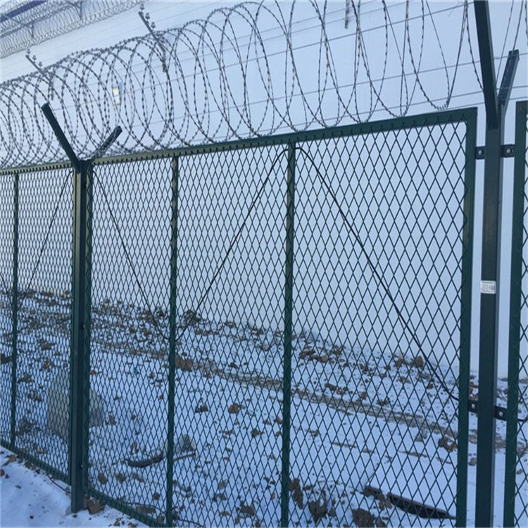 監(jiān)獄隔離網(wǎng)主要是采用高強(qiáng)度的刀片刺網(wǎng)與普通防護(hù)網(wǎng)的結(jié)合,由V型支架立拄,加強(qiáng)型焊接片網(wǎng),安全防盜連接件和刀片刺網(wǎng)組成。刀片刺網(wǎng)是一種新型防護(hù)網(wǎng),由銳利尖角鍍鋅鋼板或不銹鋼薄板做刀片,鋼絲做芯線組合而成的防護(hù)器材。
