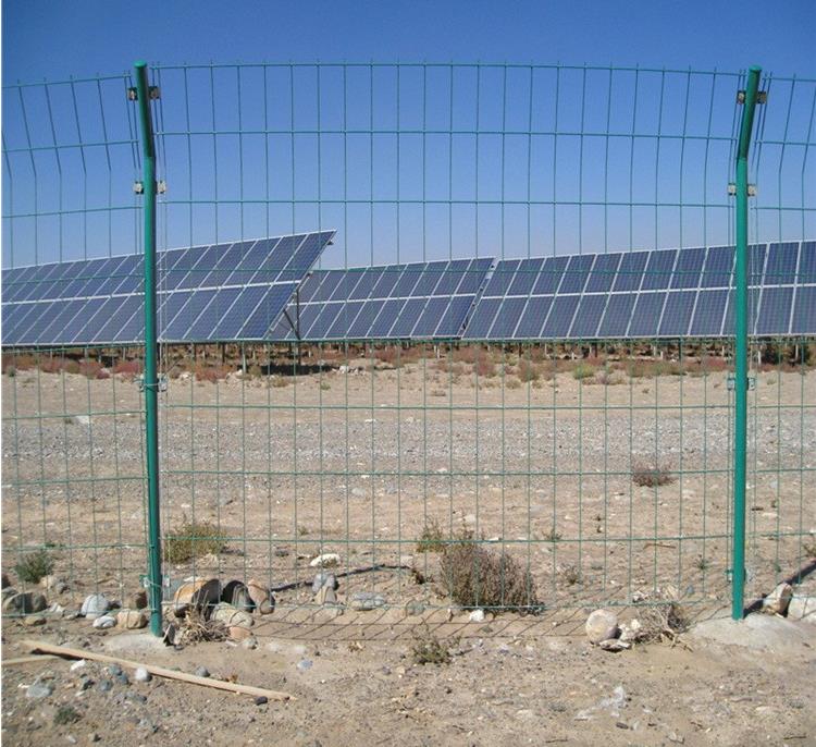 光伏電站圍欄網也叫光伏圍網、光伏電站圍欄、光伏防護隔離網。用來防止其他人或物對防護網內的光伏設施造成破壞,避免不必要的經濟損失。光伏圍網采用的是金屬絲焊接成網片,然后通過立柱將網片進行固定,從而將光伏設施進行圈圍,起到很好的防護隔離作用。