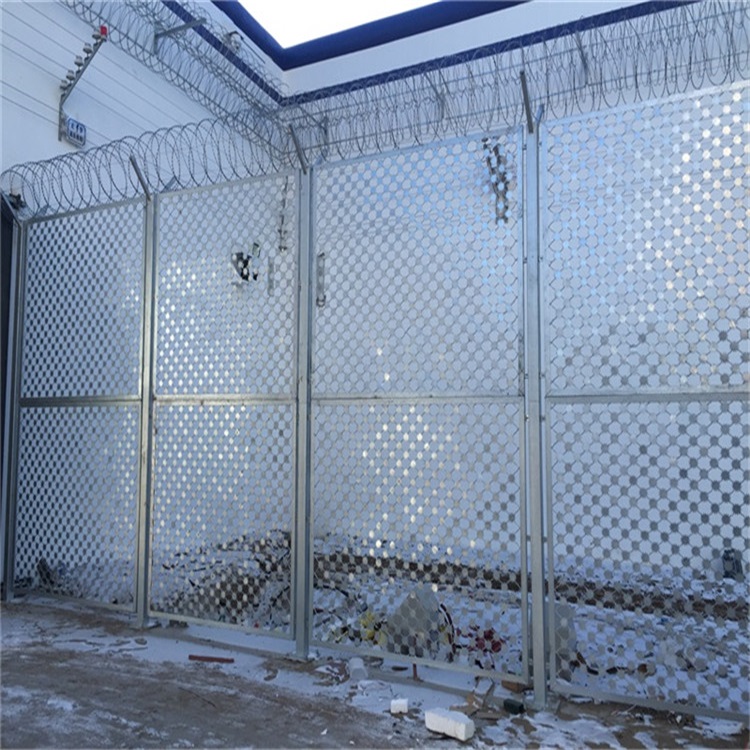 監獄鋼網墻由焊接鋼網加蛇腹形刀刺網組合而成。產品具有結構新穎、堅固緊密、網面平整、網孔均勻、刀鋒銳利、防攀爬、抗腐蝕性強,在網墻內側或頂部加裝蛇腹形刀刺網,形成一道高不可攀,難以逾越的隔離障礙。配合高壓打擊電網、各種監控報警設備確保監獄安全。