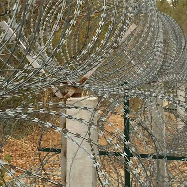 它采用鋼板沖壓成型包附于鋼絲(筋絲)之上,由銳利尖角鍍鋅鋼板或不銹鋼薄板做刀片,高張力鋼絲做芯線組合而成的。鋒利的刀型刺由雙線扣裝后成蛇腹狀,既美觀又讓人不寒而栗。