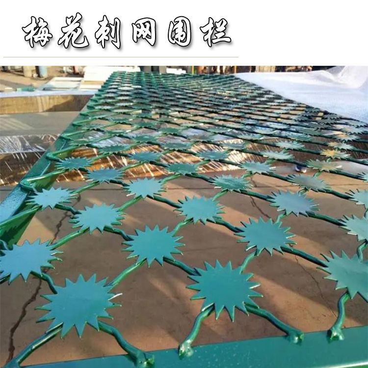 梅花刺片:梅花刺片直徑不小于7.5cm(直徑6cm、7cm、8cm),刺片厚1.5mm,采用Q235低碳鋼板沖壓成型。梅花刺片用氬弧焊將梅花形刺片焊接在美格網的節點上,形成刺形保護,有效的防止了手握腳攀。