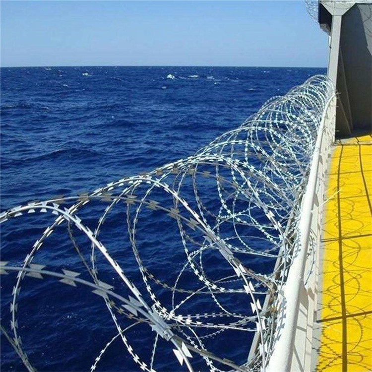 刀刺網(wǎng)有螺旋式刀片刺網(wǎng),交叉式刀片刺網(wǎng),平板式刀片刺網(wǎng),刺絲滾籠等多種稱呼。主要用干軍方車地,監(jiān)獄,銀行。以及生活小區(qū)圍墻、私人住宅、別墅的圍墻、門窗、高速公路、鐵路護(hù)欄以及邊境線等用來(lái)防護(hù)保安。刀片刺網(wǎng)又名刮刀型刺絲,是一種新發(fā)展起來(lái)的防護(hù),隔離能力較強(qiáng)的新型防護(hù)網(wǎng)產(chǎn)品。鋒利的刀型刺由雙線扣裝后成蛇腹?fàn)睿让烙^又讓人不賽而栗。起到了很好的阻嚇作用。同時(shí)該產(chǎn)品具有美觀,運(yùn)輸方便,施工便利等優(yōu)點(diǎn)。刀片刺繩一般用于監(jiān)獄做防護(hù)用,因刀片鋒利不易觸摸,讓人望而聲畏,起到很好的防護(hù)效果。同時(shí)價(jià)格也不高,所以刀片刺繩越來(lái)越應(yīng)用廣泛。中國(guó)監(jiān)獄基本上用的都是刀片刺網(wǎng)。它采用鋼板(刀板)沖壓成型包附于熱鍍鋅鋼絲(芯線)之上,由銳利尖角鍍鋅鋼板或不銹鋼薄板做刀片,高張力鋼絲做芯線組合而成的。