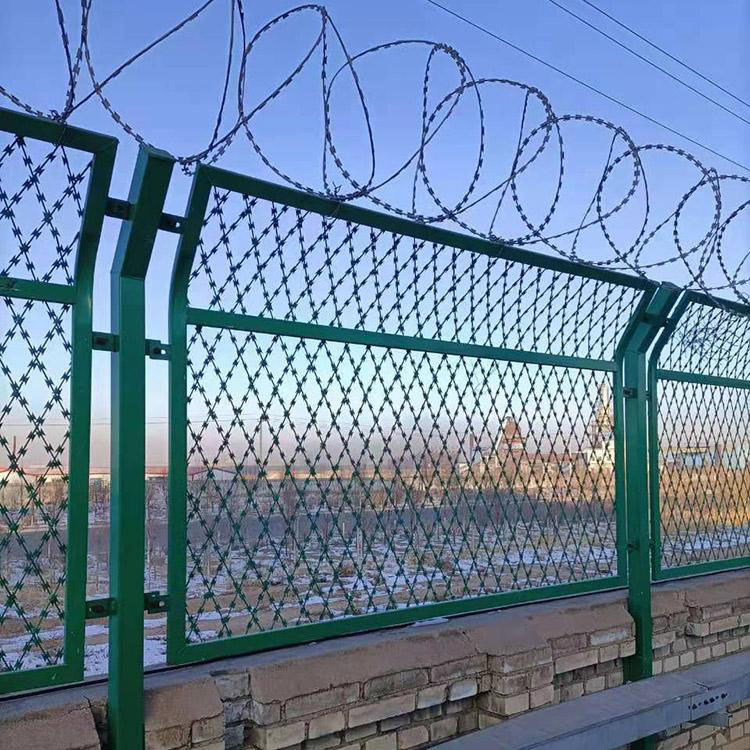 監獄鋼網墻V型支架加裝防拆卸刀刺網。刀刺網的直徑一般為500mm、600mm、800mm,材質均為優質304不銹鋼,鎳含量8個以上。刺網芯線直徑為2.5mm、刀片長22mm,刀片寬度15mm,刀片間距34mm,刀片厚度0.5mm。