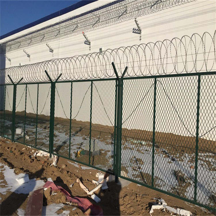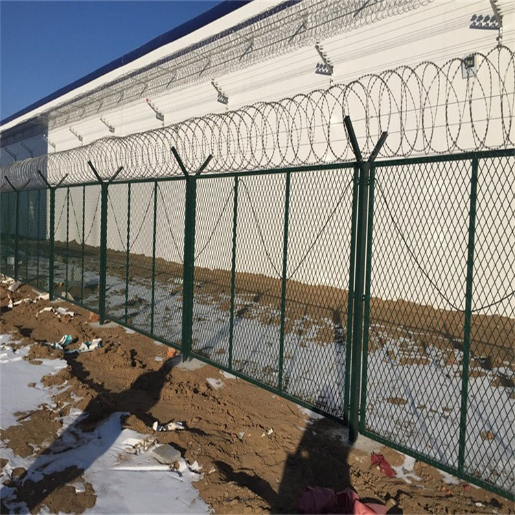 監獄圍墻加裝隔離網是V型支架立柱.加強型焊接片網,安全防盜連接件和熱鍍鋅刀片刺籠組成,強度和安全防御性級別很高。在監獄圍墻加裝隔離網頂部加裝刀片刺絲刀片刺網又名刮刀型刺絲,刀片刺網又名刮刀型刺絲,是一種發展起來的防護、隔離能力較強的新型隔離網產品。監獄通過對罪犯執行刑罰,剝奪其人身自由,使他們與社會隔離,失去再犯罪的條件,以防止服刑期間重新違法犯罪,監獄看守所鋒利的刀型刺由雙線扣裝后成蛇腹狀,像一條帶刺的大蛇,既美觀又讓人不寒而栗。起到了很好的阻嚇作用。