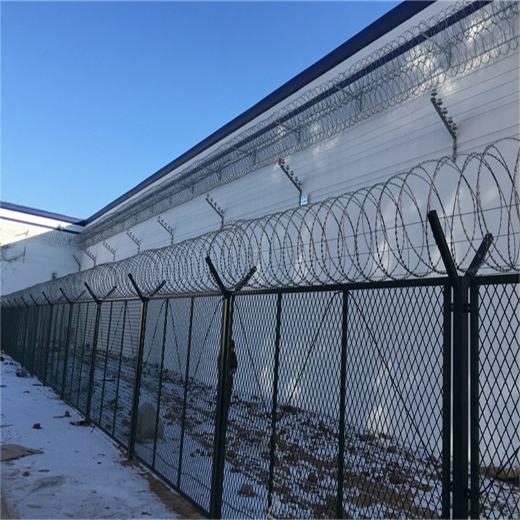監獄護欄網也叫做監獄隔離柵、監獄鋼網墻、監獄隔離網。主要是普通防護網與高強度的刀片刺網的結合,由加強型焊接片網,V型支架立拄,安全防盜連接件和刀片刺網組成。刀片刺網是一種新型防護網,由銳利尖角鍍鋅鋼板或不銹鋼薄板做刀片,鋼絲做芯線組合而成的防護器材。