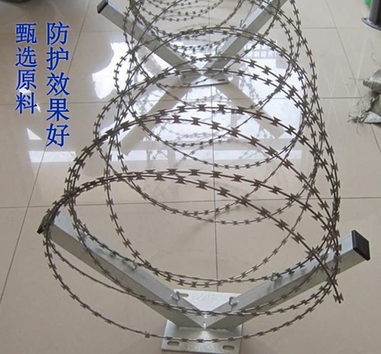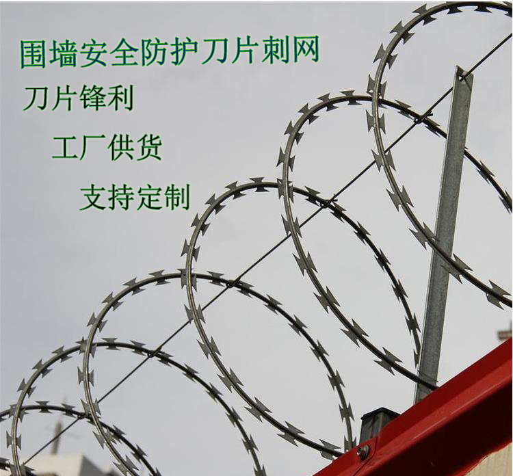 刀片刺網(wǎng)是近年來新興的一種具有很強防護功能的護欄、隔離能力較強的產(chǎn)品。材質(zhì)選用低碳鋼絲、鋁鎂合金絲,噴塑,編焊而成。又稱之為:"蛇腹網(wǎng)"、“刮刀型刺網(wǎng)”,刀片采用kang腐蝕性的熱鍍鋅鋼板或不銹鋼板為材料,采用專用機械強力包附在熱鍍鋅高碳鋼絲或不銹鋼絲做的芯線上。