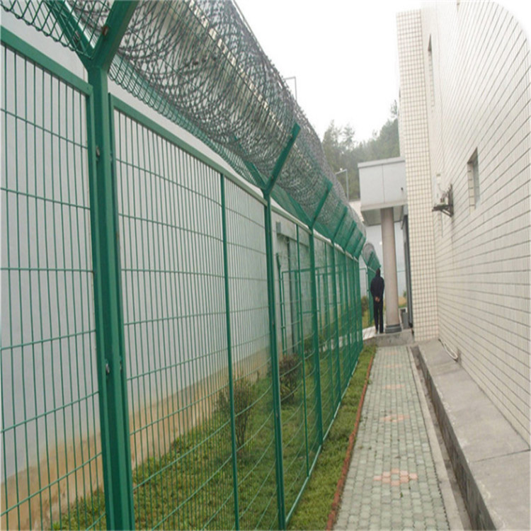 監獄護欄網墻頂部按照要求安裝蛇腹形刀刺網,立柱頂部的V型直接兩個側臂焊接有刺網勾,每個側架設三道熱鍍鋅鋼絲,形成一個v型槽,然后把刀刺網放到上面,再用配套卡扣把鋼絲和刀刺網連接到一起,如果v型架內安裝V型網架,安裝就更簡單了,直接把刀刺網連接到v型網上面就可以了。
